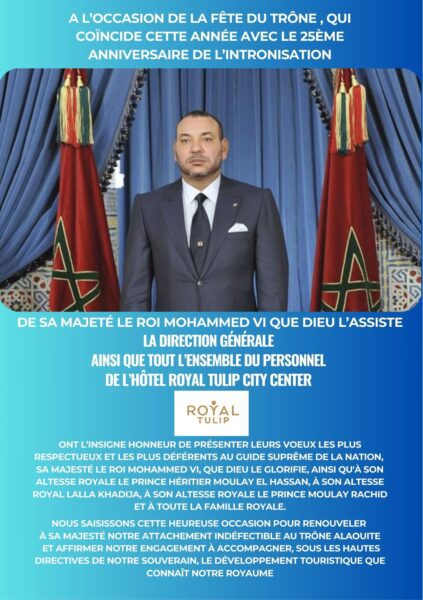 Home»Tourisme»À l’occasion de la Fête du Trône, le Royal Tulip City Center adresse ses félicitations à Sa Majesté le Roi Mohammed VI