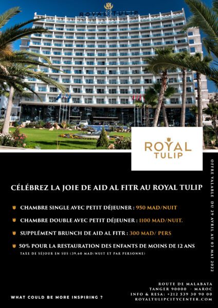 Pendant cette période, vous bénéficierez de plaisirs très spéciaux à l’hôtel Royal Tulip City Center Tanger, il vous propose de profiter de moments privilégiés avec son offre spéciale Aïd. Du 29 avril au 3 mai, soit une chambre single à 950 dirhams, ou une chambre double à 1.100 dhs, les deux offres avec petit déjeuner. Accueillantes où il fait bon se poser, les chambres de l’hôtel Royal Tulip vous offrent une atmosphère raffinée et luxueuse qui appelle à la sérénité.