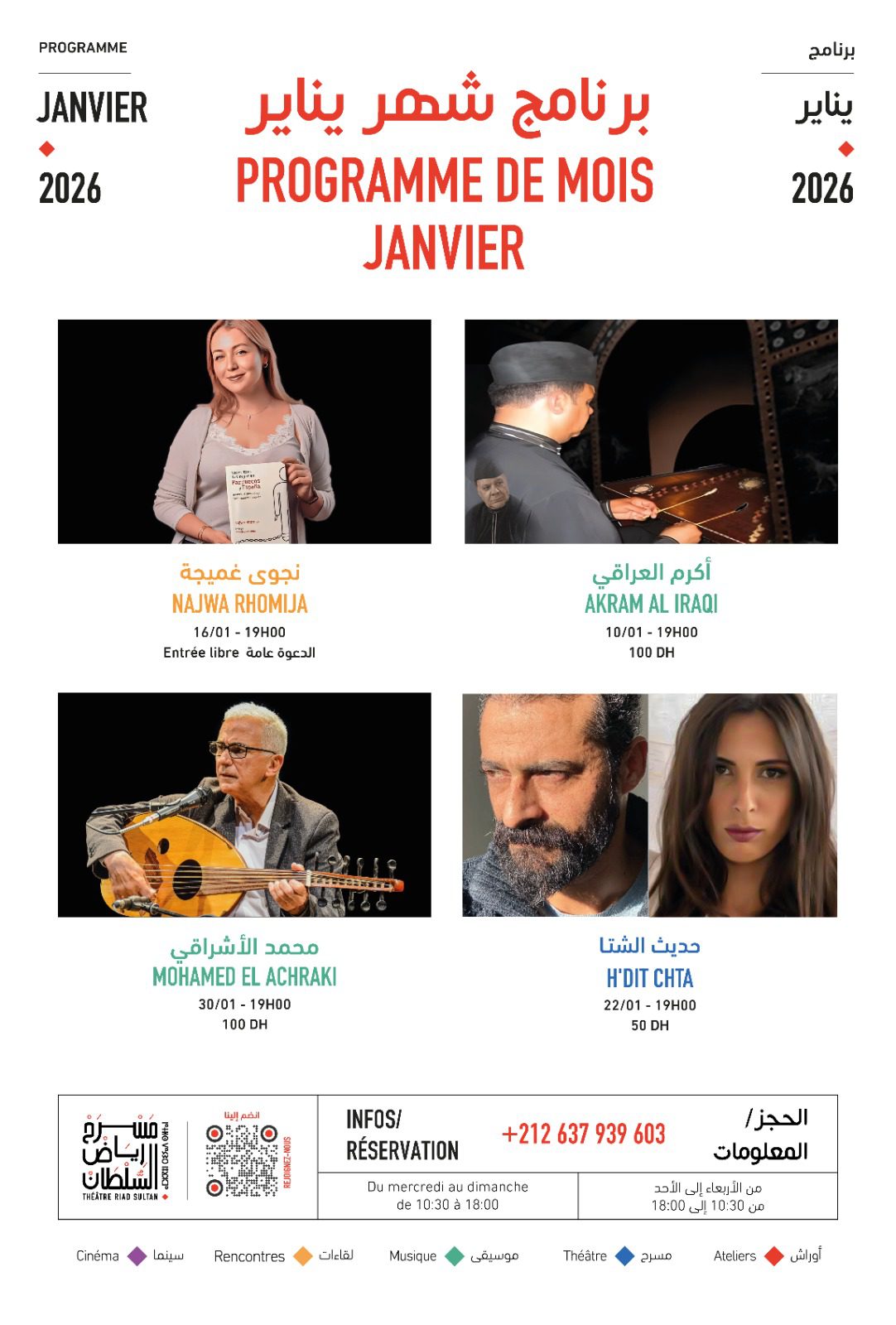 Au Théâtre Riad Sultan, la programmation de janvier 2026 confirme la vocation du lieu : un espace où arts vivants, musique, théâtre et littérature éveillent les sens et nourrissent le dialogue culturel, au cœur de la médina.