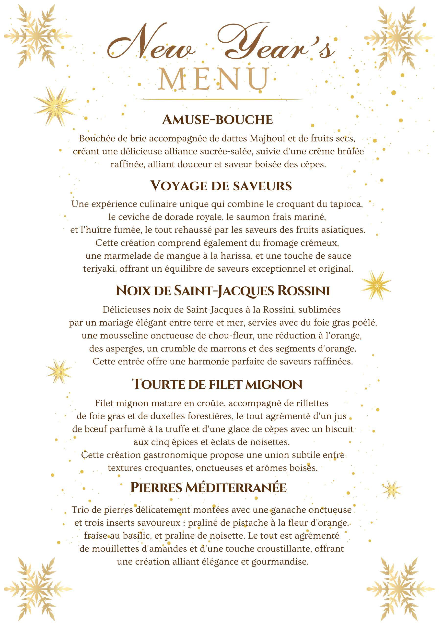 La soirée débutera par un somptueux dîner de réveillon, où vous pourrez savourer une cuisine raffinée aux saveurs variées. Khalil, le grand Chef de l’hôtel a élaboré un menu spécial alliant spécialités marocaines et internationales pour ravir vos papilles. Dans un cadre élégant et chaleureux, vous dégusterez des mets de qualité tout en vous préparant à vivre une soirée mémorable.
