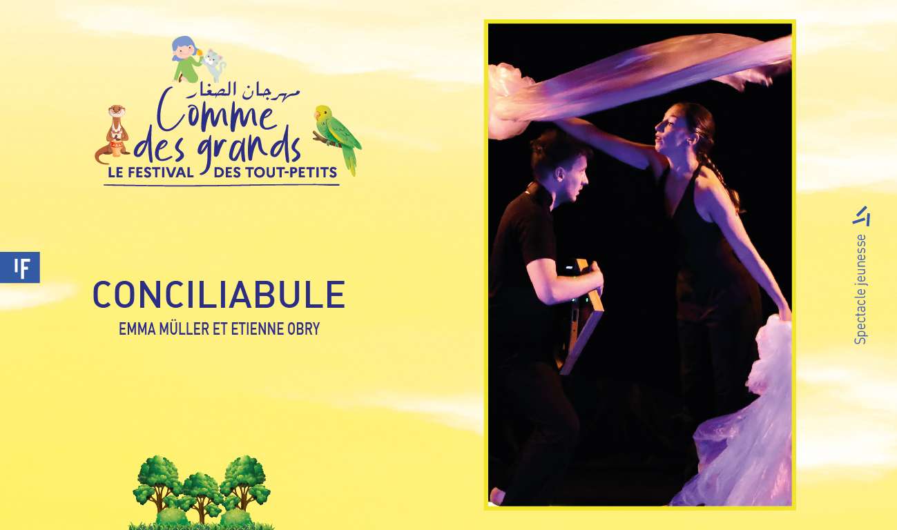 - Samedi 15 février : Conciliabule Tout public à 10h30 + 1 atelier parents/enfants à l’issu du spectacle – Théâtre 121 – Institut français à Casablanca, 121 bd Zerktouni