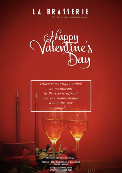 Le mois de février est là et la Saint-Valentin s’approche donc à grands pas. Comme le dit le dicton; il n’y a pas d’amour, seulement des preuves d’amour! Alors pour prouver que vous êtes de grands romantiques, rendez-vous le 14 février au restaurant « La Brasserie » de l’hôtel Farah Tanger.