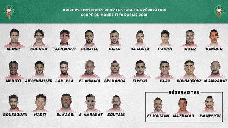 Le sélectionneur national Hervé Renard a rendu publique, ce jeudi, la liste des 26 Lions de l’Atlas, dont 3 réservistes, qui prendront part à la Coupe du monde 2018 de football en Russie, prévue du 14 juin au 15 juillet.
