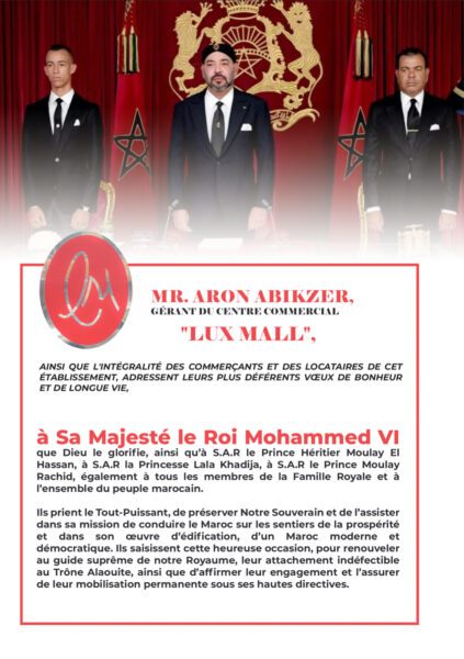 Le Centre Commercial LUX MALL adresse les vœux au Roi Mohammed VI