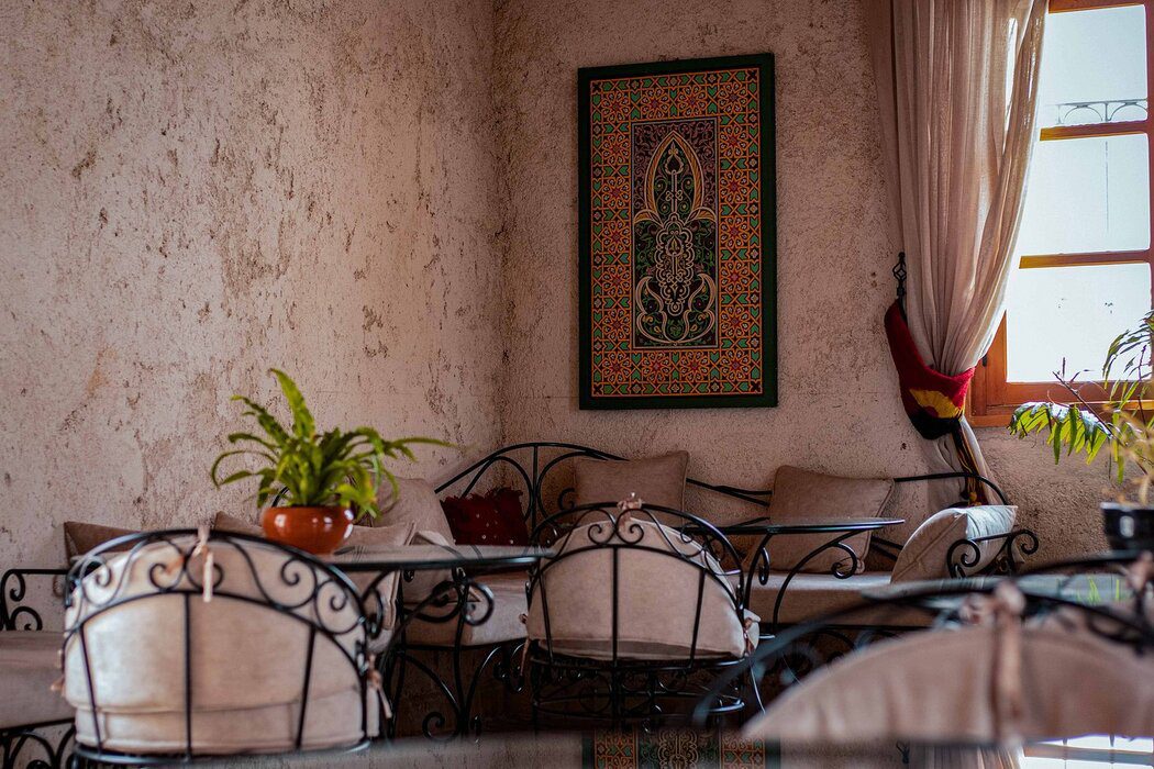 Fendek Dar Dbagh, c’est une terrasse ombragée par les bougainvilliers, un café-restaurant au charme local et traditionnel, une atmosphère douce, faite de briques anciennes et de zelliges polis : tout est fait pour que le temps ralentisse. On y déguste un tajine parfumé, une pastilla sucrée, un couscous, ou tout simplement un thé à la menthe sous les voûtes. Le bâtiment, restauré avec soin, redevient ce qui il était autrefois, un point de rencontre, un espace de culture, un carrefour pour les curieux.