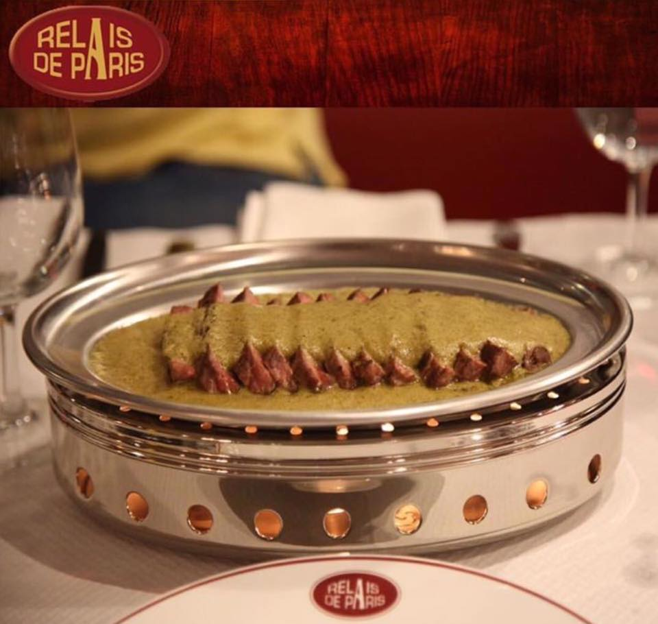 Relais de ParisRestant fidèle à son riche héritage, Le Relais de Paris met à l’honneur la gastronomie française avec un menu généreux et méticuleusement élaboré. Les amateurs de viande y retrouveront des pièces d’exception entre autre l’entrecôte accompagnées de la célèbre sauce Relais, véritable signature de la maison. Le menu inclut également :