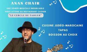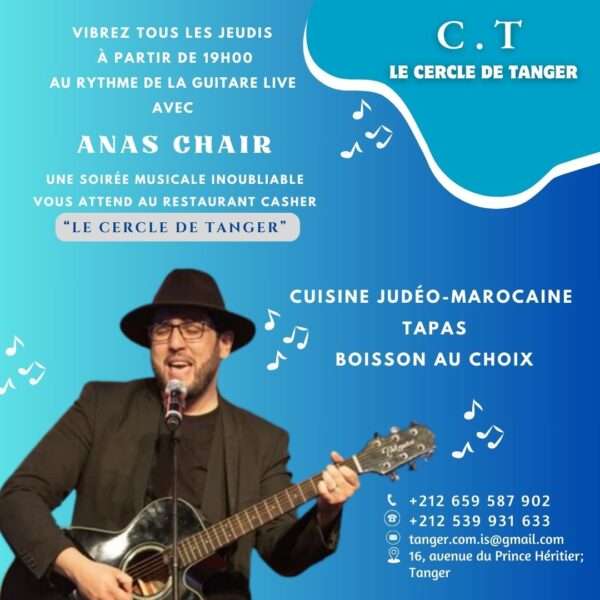 Que vous soyez plutôt blues, rock’n roll, pop, arabe classique, ou encore jazz, au son de sa guitare et sa voix Anas, vous fera tous les jeudis à partir de 19h, voyager à travers la musique du monde et vous fera passer une soirée dans une atmosphère décomplexée et spontanée autour d’un repas judéo-marocain et d’une boisson accompagnée de tapas.