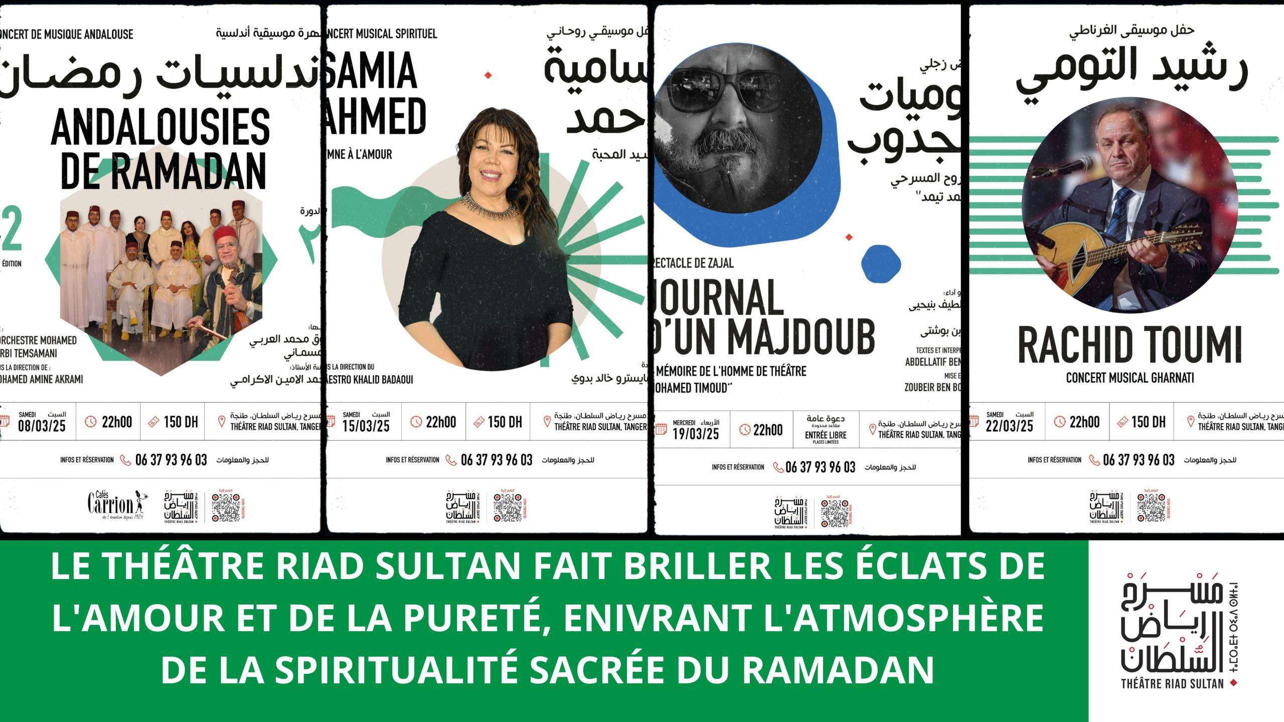 À l’occasion du Ramadan 2025, le mois sacré où les âmes s’illuminent de lueurs d’amour et de sérénité, le Théâtre Riad Sultan accueille son fidèle public passionné avec une programmation empreint de spiritualité et de beauté. Intitulé « Spiritualités Ramadanésques », des rencontres entre la sensibilité et l’émotion, entre la créativité et la contemplation, où les mélodies s’harmonisent avec les battements des cœurs, et où la scène se transforme en un espace de rêve et d’élévation.
