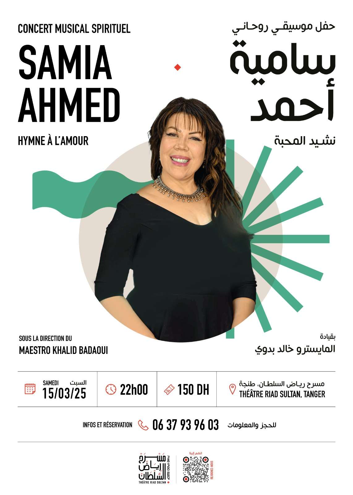 La talentueuse Samia Ahmed, dotée d’une voix envoûtante, nous embarquera dans un voyage spirituel à travers des chants dont l’écho résonne entre le cœur et le ciel. Une performance qui sublimera l’amour sous ses dimensions les plus spirituelles, sous la direction du maestro Khalid Badaoui.