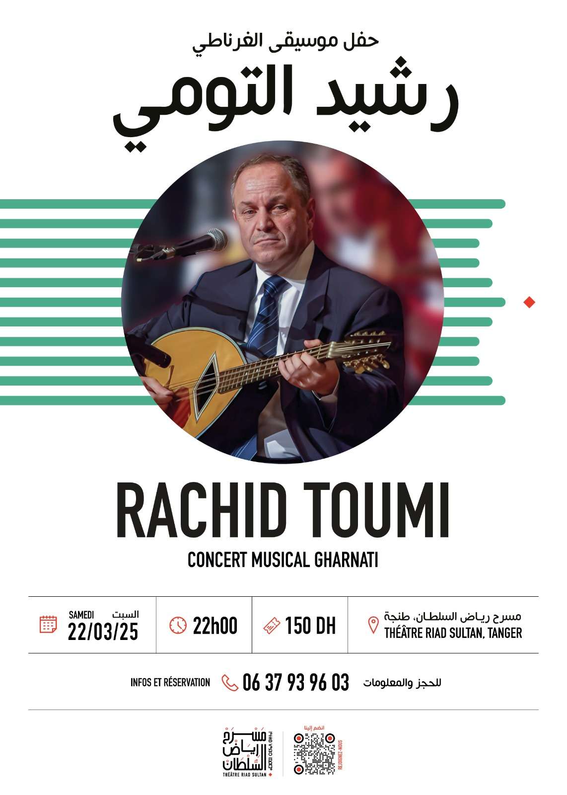 Une nuit musicale où résonneront les rythmes envoûtants du tarab andalou, avec l’exceptionnel Rachid Toumi. Un hommage vibrant aux noubas et maqams, plongeant le public dans une symphonie où passé et présent se rencontrent pour faire revivre les sonorités du paradis perdu de l’Andalousie. Un concert où la musique devient un héritage immortel, transmis de génération en génération.