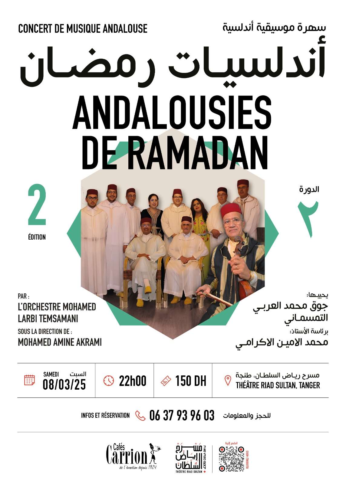 L’orchestre Mohamed El Arabi Temsamani, sous la direction du maître Mohamed El Amine El Akrami, fera vibrer les cordes du temps et diffusera le parfum enivrant de Grenade et Séville, en ravivant les mélodies d’une civilisation andalouse toujours vivante dans le cœur des amateurs d’art noble. Une soirée où se mêleront musique ancestrale et voix suaves.
