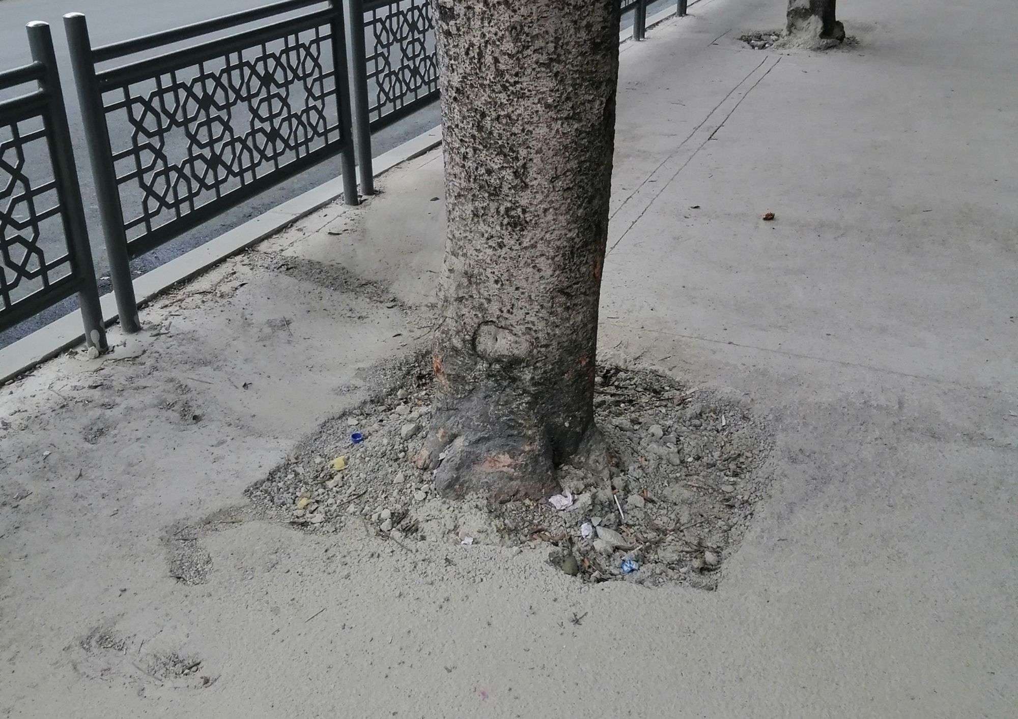 Cependant, en observant plus attentivement, entre les échafaudages et les pelles mécaniques, un détail attire l’attention : des arbres, plantés il y a des années, parfois même des décennies, sont aujourd’hui littéralement piégés dans le ciment. Ils n’ont aucun espace pour respirer, pas un centimètre de terre autour de leurs troncs, juste une dalle grise parfaitement lissée qui semble dire : « Merci pour votre contribution, vous pouvez mourir en silence maintenant. »