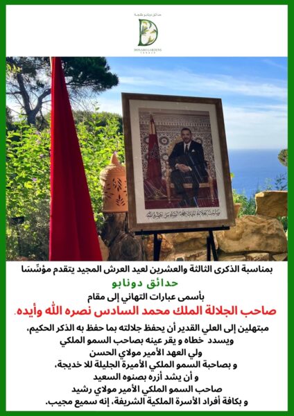 Partager Facebook Twitter LinkedIn Pinterest Email Copy Link بمناسبة الذكرى الثالثة والعشرين لعيد العرش المجيد يتقدم مؤسِّسَاحدائق دونابو بأسمى عبارات التهاني إلى مقام صاحب الجلالة الملك محمد السادس نصره الله وأيدهمبتهلين إلى العلي القدير أن يحفظ جلالته بما حفظ به الذكر الحكيمويسدد خطاه و يقر عينه بصاحب السمو الملكيولي العهد الأمير مولاي الحسنو بصاحبة السمو الملكي الأميرة الجليلة للا خديجةو أن يشد أزره بصنوه السعيدصاحب السمو الملكي الأمير مولاي رشيدو بكافة أفراد الأسرة الملكية الشريفة، إنه سميع مجيب