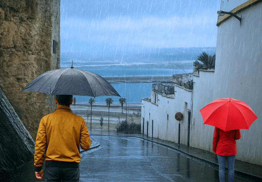 La pluie, souvent drue et imprévisible, transforme la ville en un lieu de contrastes saisissants. Les terrasses désertées des cafés accueillent désormais des flaques où les passants se reflètent, chapeaux et parapluies improvisés contre le déluge. Les odeurs de la mer, de l’embrun salé et du jasmin mouillé s’entremêlent, éveillant les sens avec une intensité rare. Et pourtant, malgré le tumulte, Tanger ne perd jamais son charme : les petites échoppes continuent de battre leur rythme, les vendeurs s’abritent sous des auvents, et le thé à la menthe chaud devient un refuge, une pause réconfortante dans la tourmente.