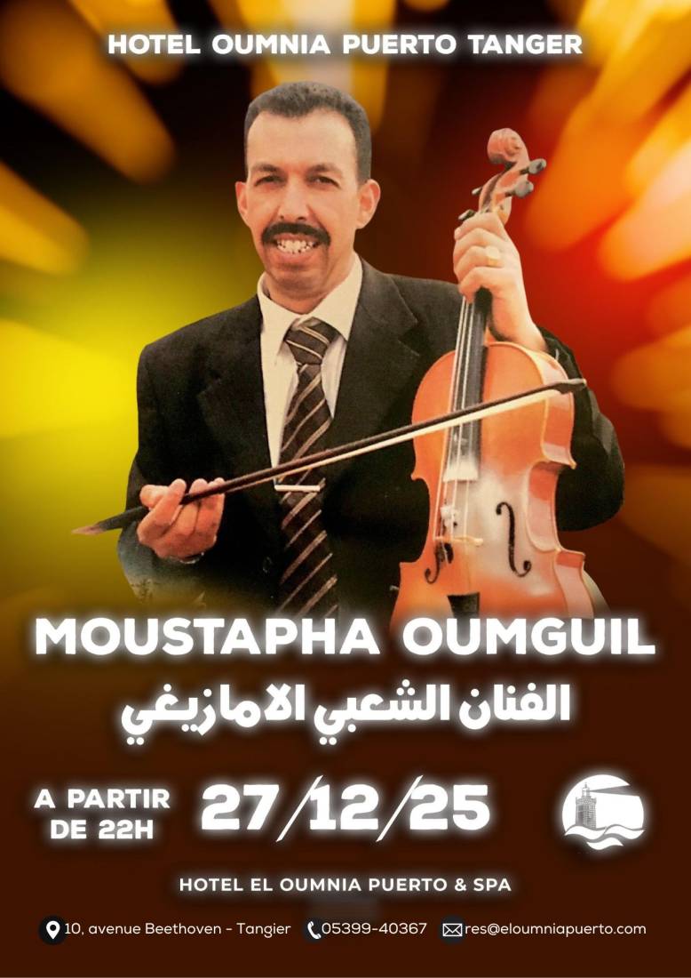 Ne manquez pas cette occasion de vivre une nuit inoubliable au son de Mustapha Oumguil et de ses invités. Rendez-vous le samedi 27 décembre à 22h00 à l’Hôtel El Oumnia Puerto pour une soirée musicale riche en émotions et en couleurs. Réservez vos places dès maintenant pour être au cœur d’un événement exceptionnel qui fera vibrer tous les amateurs de musique marocaine !