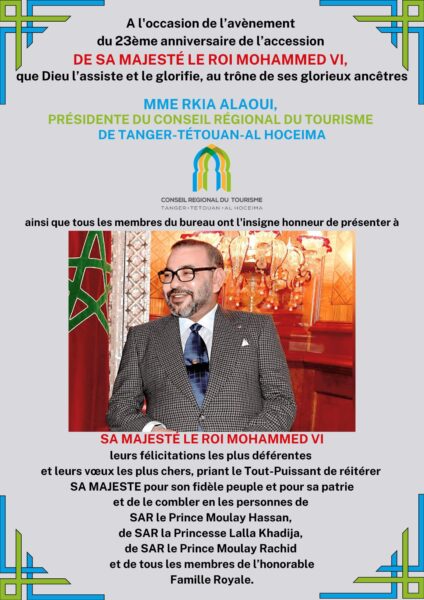 A l’occasion de l’avènement du 23ème anniversaire de l’accession de Sa Majesté le Roi Mohammed VI, que Dieu l’assiste et le glorifie, au trône de ses glorieux ancêtres Mme Rkia Alaoui, Présidente du Conseil Régional du Tourisme Tanger-Tétouan-Al Hoceima, ainsi que tous les membres du bureau ont l’insigne honneur de présenter à SA MAJESTÉ LE ROI MOHAMMED VI leurs félicitations les plus déférentes et leurs vœux les plus chers, priant le Tout-Puissant de réitérer SA MAJESTE pour son fidèle peuple et pour sa patrie et de le combler en les personnes de SAR le Prince Moulay Hassan, de SAR la Princesse Lalla Khadija, de SAR le Prince Moulay Rachid et de tous les membres de l’honorable Famille Royale.