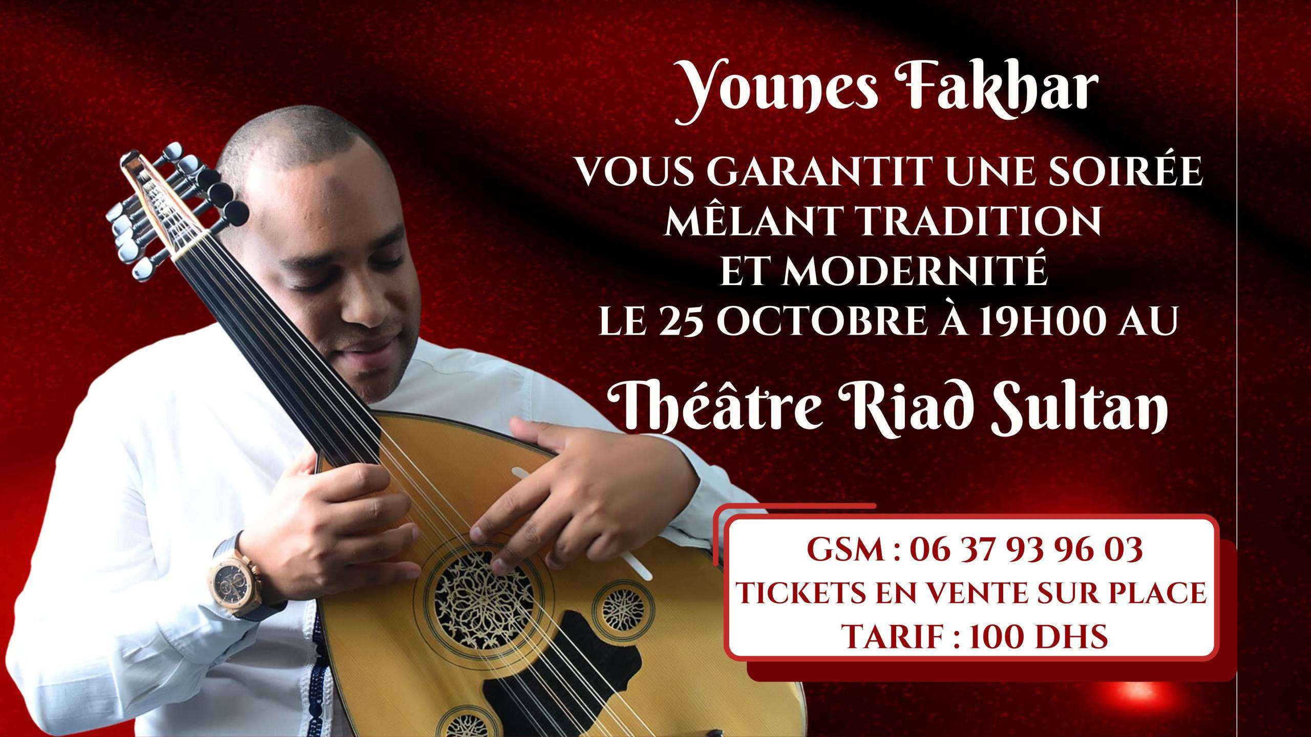 Les portes s’ouvriront à 19h, accueillant les spectateurs dans une ambiance envoûtante, où les notes de l’oud résonneront comme de douces mélodies. Les lumières tamisées de la salle du théâtre Riad Sultan créeront une atmosphère intime et chaleureuse, parfaite pour apprécier le talent exceptionnel de Younes Fakhar. Ce virtuose de l’oud vous transportera dans un voyage sonore à travers des compositions traditionnelles et modernes, rendant hommage à l’héritage riche et vibrant de cet instrument ancestral.