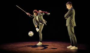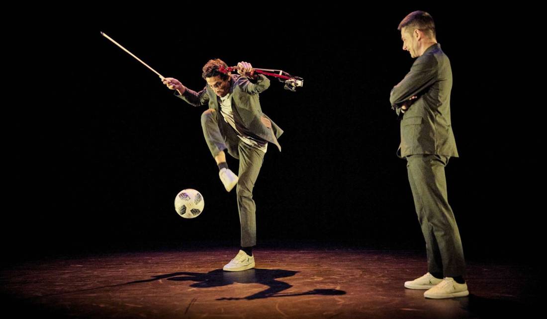 Gabriel Majou, violoniste au jeu espiègle, explore les cordes de son instrument avec finesse et malice, tandis que Paul Molina transforme le ballon de foot en véritable instrument de percussion visuelle et rythmique. Ensemble, ils créent un langage commun où musique et freestyle urbain dialoguent, transformant le plateau en un véritable terrain de jeu artistique. Pour Fouad Boussouf, maître de cérémonie à la fois arbitre et chef d’orchestre, cette rencontre est l’occasion de rythmer le spectacle, d’apporter poésie et humour, et d’inviter le public à s’immerger dans l’histoire de cette amitié naissante.