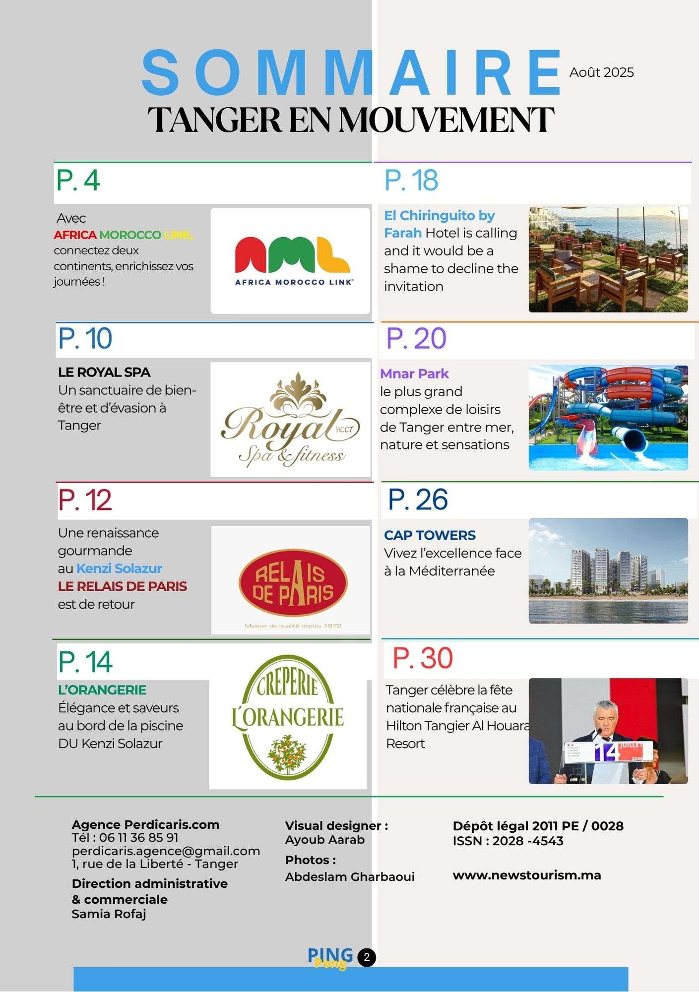 Dans cette édition estivale, retrouvez les déclarations de trois membres de la direction de la compagnie maritime Africa Morocco Link (AML), ainsi que celles du Royal Tulip City Center Tanger, sans oublier l’ambiance ensoleillée et conviviale du Chiringuito de l’hôtel Farah Tanger.